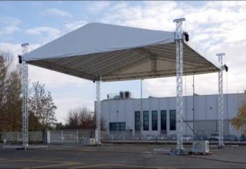 Palco modulare 12 X 10 H da 1,10 a 1,80 doppia scala di accesso parapetti e pavimento in Carply (tavole 50 x 100 antiscivolo).